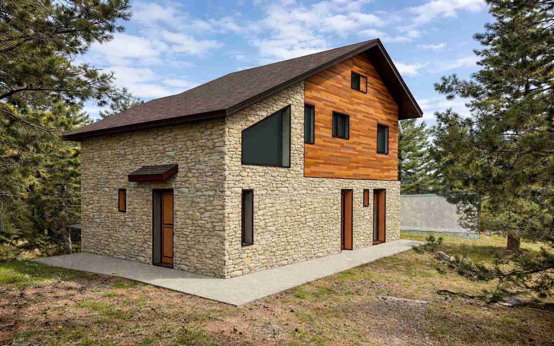 The revised design introduces a new ground floor clad in locally sourced natural stone, creating a more robust base that anchors the structure to the terrain. Above, the existing timber-clad upper levels have been retained and refreshed, preserving the familiar chalet silhouette associated with mountain architecture in the Alps.