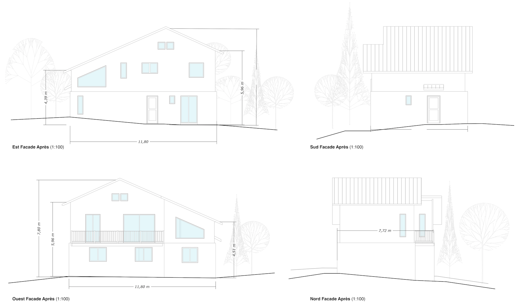 Originally built in an Alpine style, the house sits on a sloping site in the foothills of the Pyrennees. The recent project required planning permission to extend the building’s footprint and rework its façades, updating the chalet while maintaining its characteristic steep roof, wide eaves and timber balconies.
