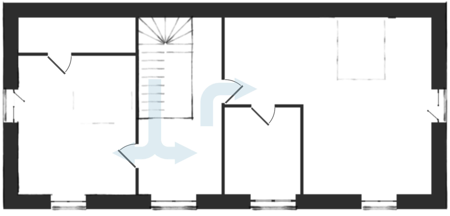 Instead of enlarging openings at ground level — often restricted by planning controls, structural constraints, or neighbouring properties — the proposal focuses on bringing daylight from above. The design introduces a dramatically expanded first-floor landing and opens the roof structure to accommodate new skylights. This approach allows sunlight to cascade through the stairwell and penetrate deep into the lower living areas, transforming the perceived quality of space without altering the building’s external footprint.